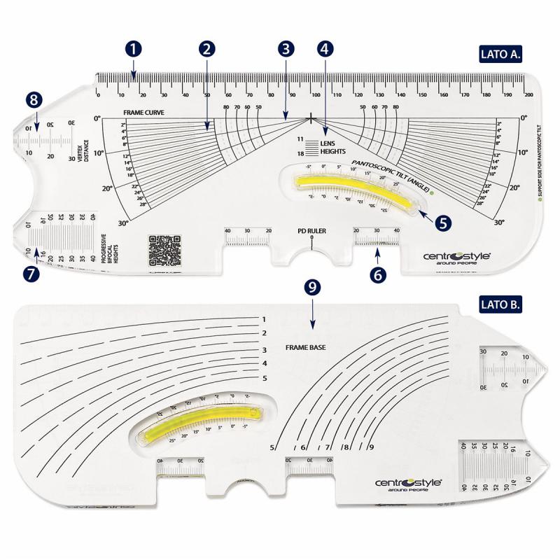 This multifunction ruler was designed to include 9 of the most useful functions for opticians for the correct fitting of lenses to the frame.